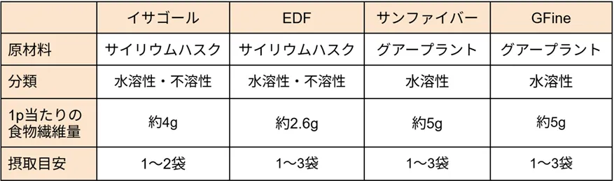IBDではサプリメントタイプの水溶性食物繊維(サイリウムやグアーガムなど)について効果は十分に検証されていませんが、食物繊維を摂取しにくい患者さんが食物繊維サプリメントを摂取することで便性が改善することがあります。以下に代表的な水溶性食物繊維のサプリメントをまとめましたので参考にしていただければと思います。