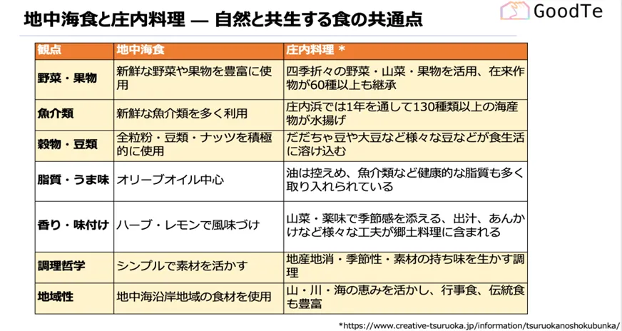 地中海食も庄内料理も、「健康に良いから食べる」というより、「自然と共に生きる中で生まれた食文化」と言えます。地元で新鮮な食材を使い、家族や仲間と囲む食卓を大切にする。社会的つながりを含めたライフスタイル全体が、心身の健康を支えています。