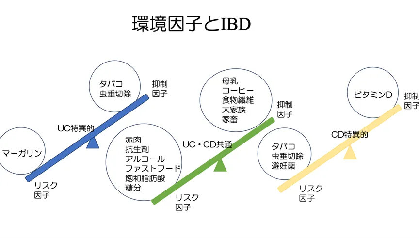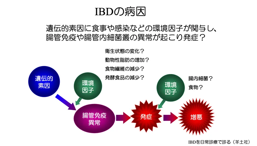 また、IBDはいずれも原因が完全に解明されていない難病とされていますが、近年の研究では、遺伝的要因と食事を含む環境因子が複雑に絡み合って発症すると考えられています。