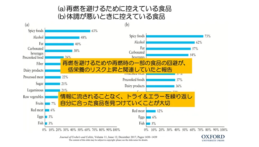 最新の研究では、患者さんが再燃を恐れるあまり、必要以上に多くの食品を避けてしまうことで、かえって低栄養のリスクが高まることも研究で示唆されています。