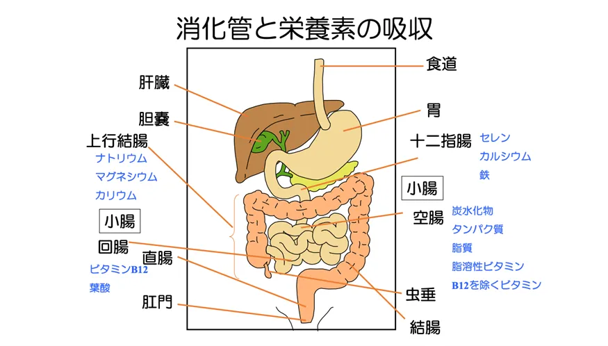 栄養の吸収場所を知ることは、血液検査で不足している栄養素の理由を理解する助けにもなり、治療や食事調整にも役立ちます。