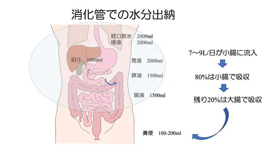 また、下痢が続くと脱水が心配になりますが、そもそも1日に7〜9リットルもの水分が小腸に流れ込んでいることをご存じでしょうか。その約80%が小腸で吸収され、残りが大腸で吸収されます。