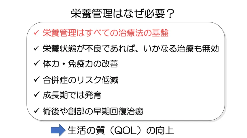 IBDの治療では、薬や手術など医学的な介入が中心ですが、それらの効果を最大限に引き出すためには、「栄養状態」がとても重要です。栄養状態が悪いと、薬が効きにくくなったり、感染症にかかりやすくなったり、手術後の回復が遅くなることが知られています。