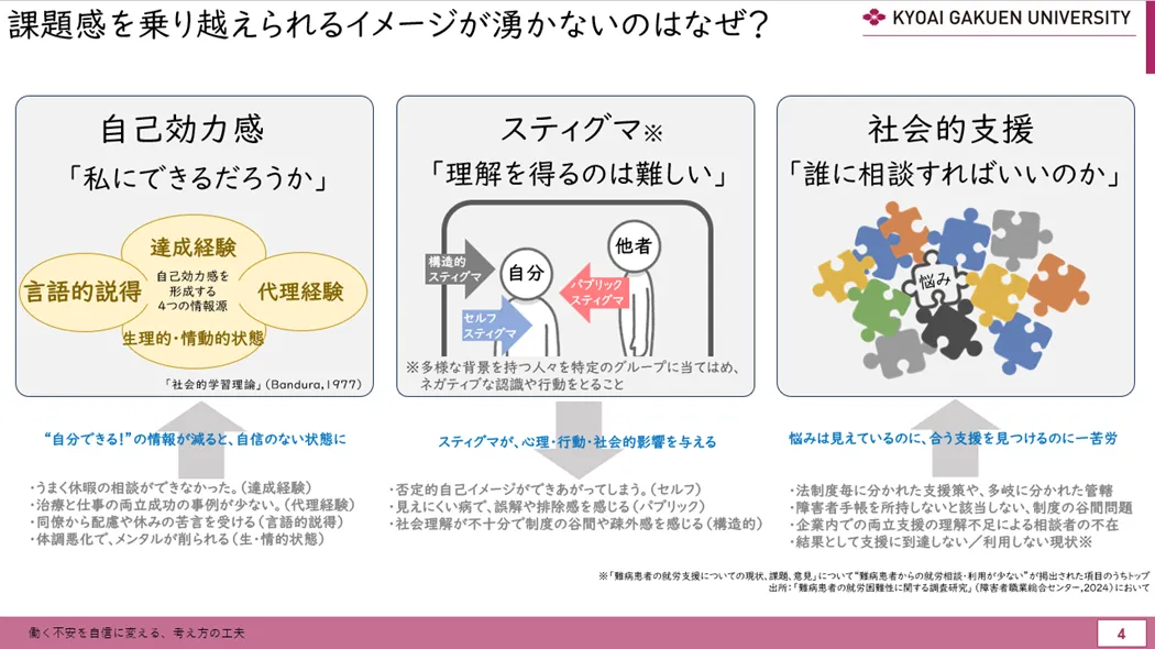 例えば、休暇の相談がうまくいかなかった経験(①)や、両立に成功している身近な事例を知らないこと(②)、体調悪化による気持ちの落ち込みなどが重なる(④)と、「自分には無理かもしれない…」といったように、自信が削がれ、不安が高まってしまいます。さらに、病気に対する社会的な偏見や、「迷惑をかけてはいけない」という思い込み等が重なることで、自分自身を過度に責めたり、制限してしまうことも少なくありません。