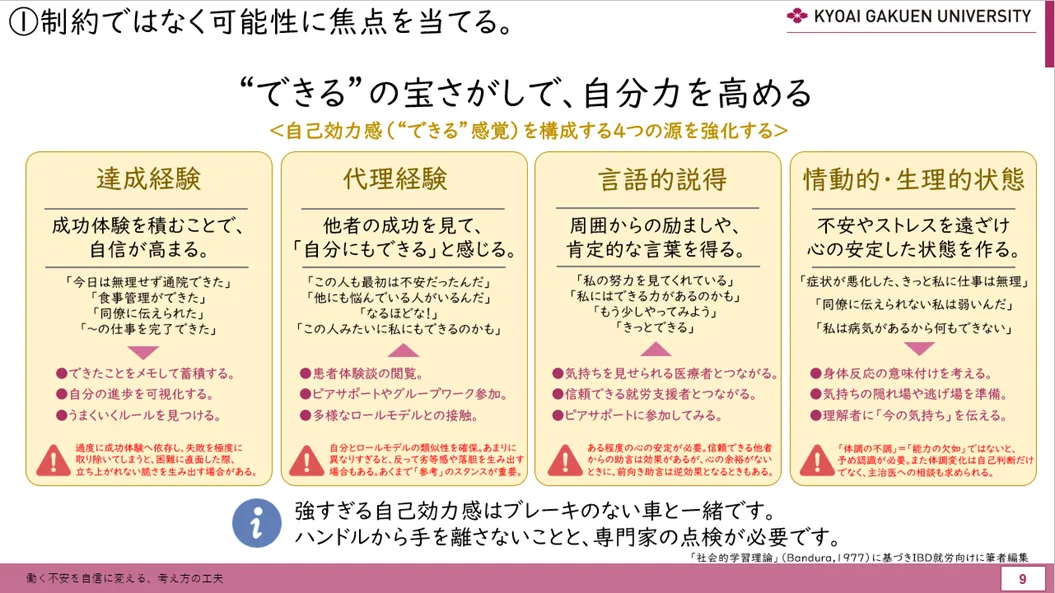 の4つに区分されますが、IBD患者さんは、これらの情報源において自己効力感が揺らぎやすい状況にあります。