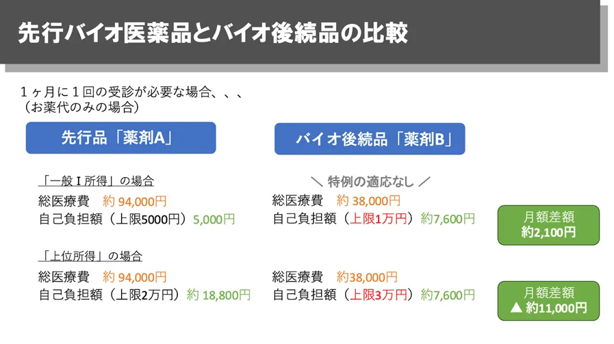 なお、バイオ後続品を活用した場合の自己負担金額については状況により異なります。以下に2つほど事例を示します。