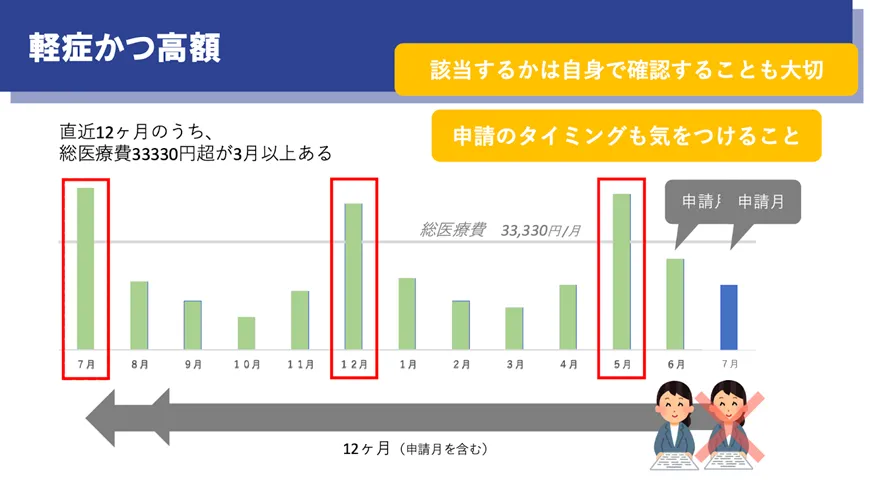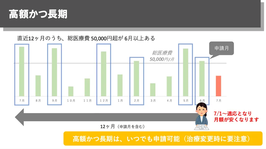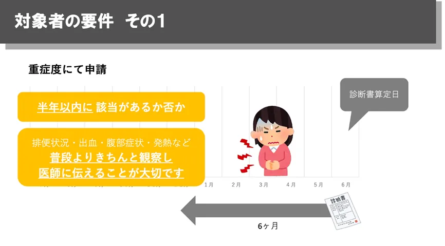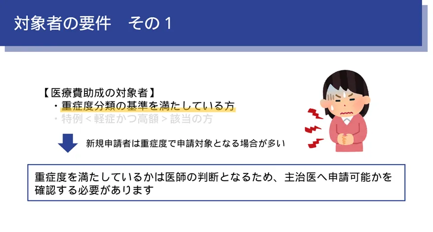 一方で、治療によって症状が落ち着いている方でも、「軽症かつ高額」という区分で助成対象となることがあります。症状が安定していても、生物学的製剤などで医療費が高額になるケースは少なくありません。この場合、直近12か月のうち、一定額を超える月が複数あるかで判断されます。