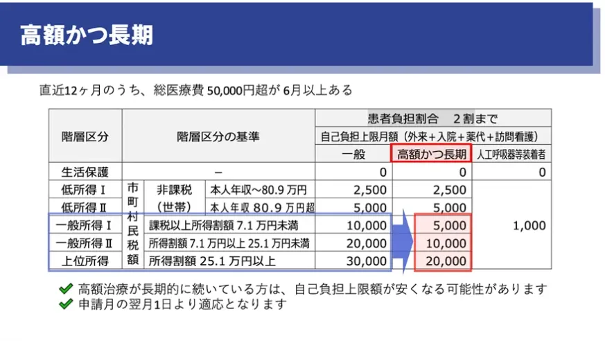 また、高額な治療が長期に続いている方は、「高額かつ長期」に該当し、自己負担上限額がさらに引き下げられる可能性があります。