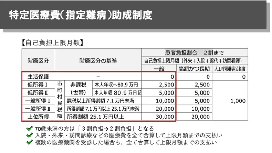 指定難病の受給者証を取得すると、入院・外来・訪問診療など、指定難病に関する医療費をすべて合算したうえで、月ごとの自己負担上限額までの支払いとなります。複数の医療機関を受診している場合でも合算されるため、「病院ごとに上限が別になる」ことはありません。