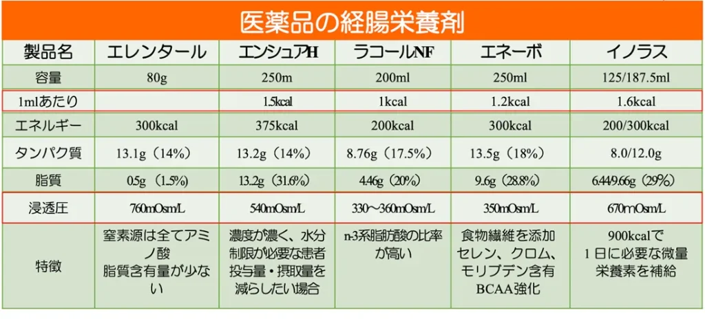 それぞれの製品には「脂質が極めて少ない(エレンタール)」「食物繊維が含まれる(エネーボ)」などの特徴があるため、主治医や管理栄養士と相談して選びましょう 。