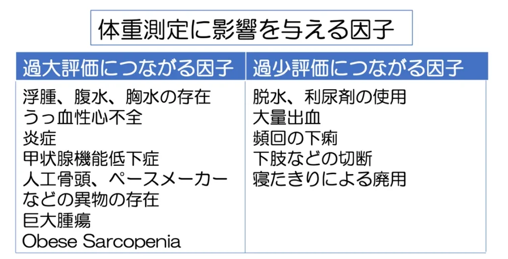 ※むくみ(浮腫)がある場合は体重が過大評価され、脱水や下痢がひどい時は過少評価されるため注意が必要です 。