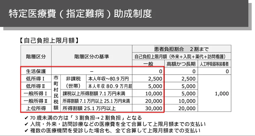 指定難病の受給者証を取得すると、入院・外来・訪問診療など、指定難病に関する医療費をすべて合算したうえで、月ごとの自己負担上限額までの支払いとなります。複数の医療機関を受診している場合でも合算されるため、「病院ごとに上限が別になる」ことはありません